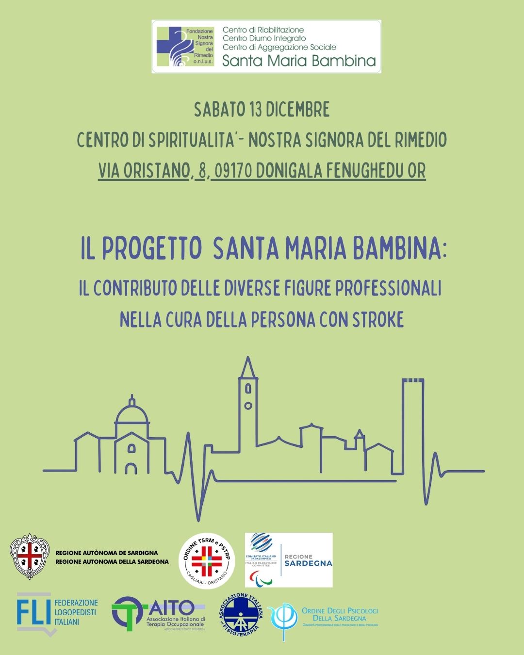 Sabato 13 dicembre 2025 dalle ore 8 alle 18, presso il centro di spiritualità Nostra Signora del Rimedio, in Via Oristano,8 a Donigala Fenughedu (OR), ci sarà l'evento gratuito ECM (8 crediti) patrocinato dall'Ordine delle Psicologhe e degli Psicologi della Sardegna dal titolo" Il progetto Santa Maria Bambina: il contributo delle diverse figure professionali nella cura della persona con stroke".